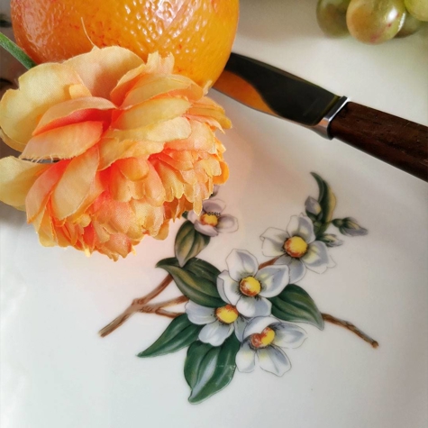 Porcelænsstel på cremefarvet bund med guldkant og smukke jasminblomster.