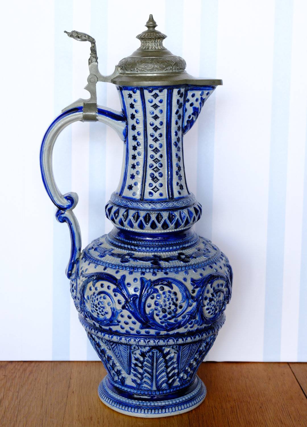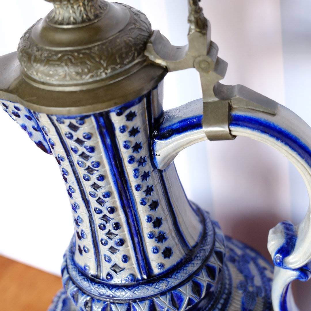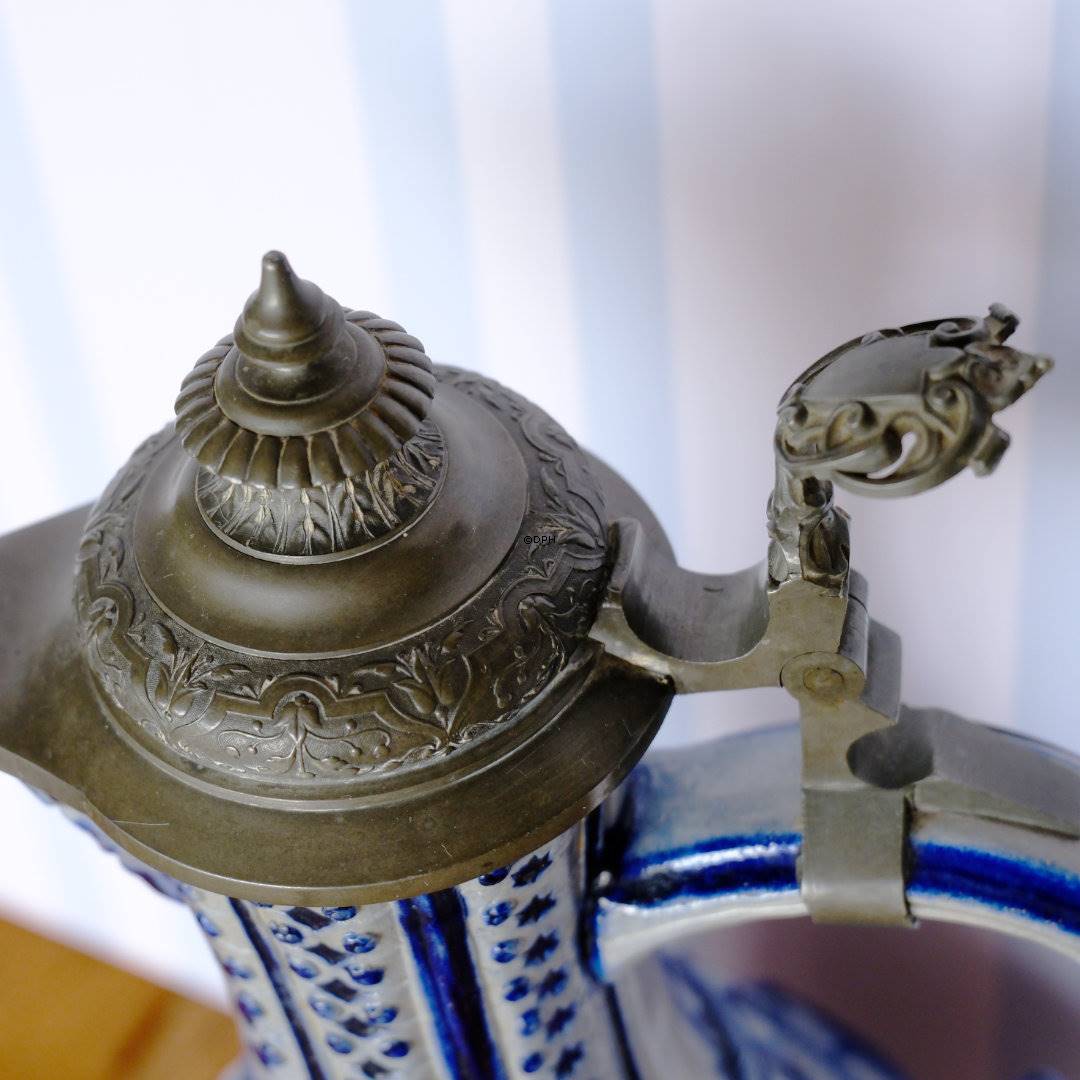 Særdeles smuk kande med mange detaljer. Grå bundfarve med blå dekorationer og tin låg.