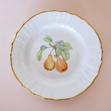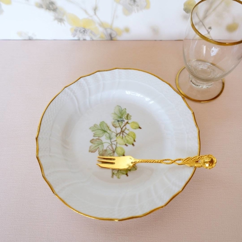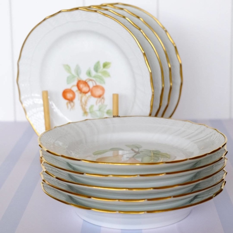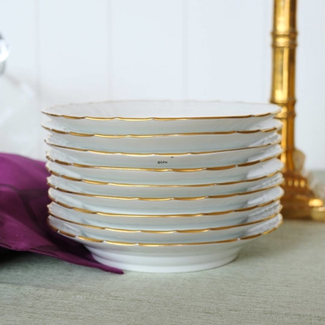 Royal Copenhagen sæt bestående af 9 tallerkener på 20 cm i diameter med forskellige motiver i midten og guldkant. Dekorationen i midten af tallerken er udført ovenpå glasuren (overglasur). Bagpå tallerkenerne er der påskrevet "Mina Thygesen 1962".