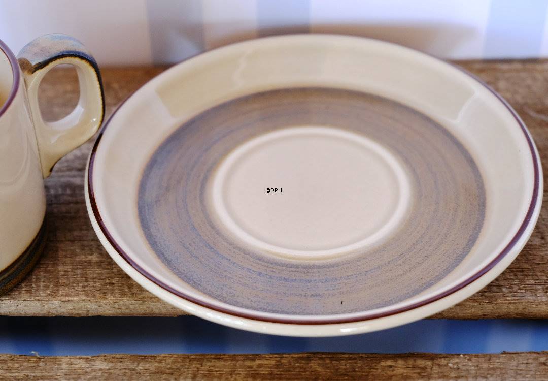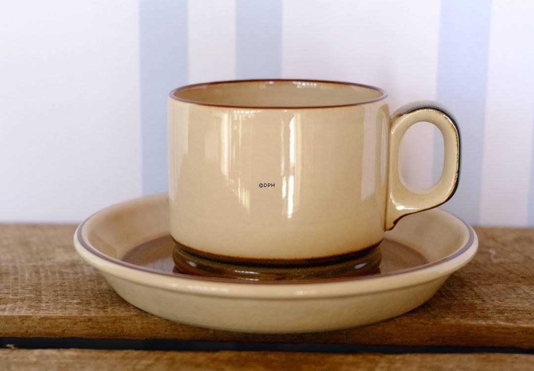 Bing & Grøndahl Peru stentøjsstel, kaffekop med underkop. Beige bundfarve med bred brun/grønlig kant på underkoppen og hanken på koppen.