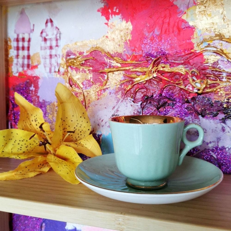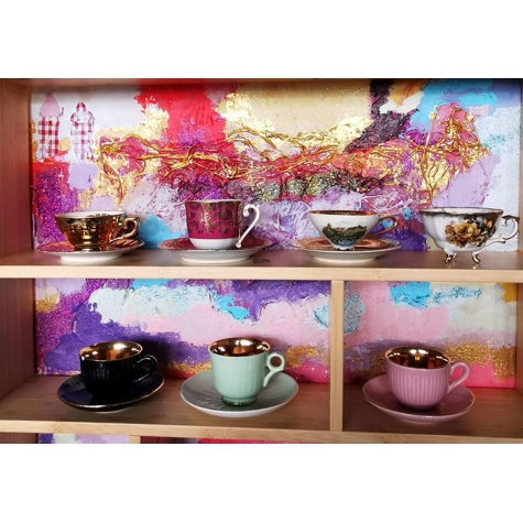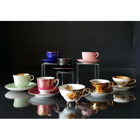 Mokkakopper med underkop, 7 forskellige (2 med skår)