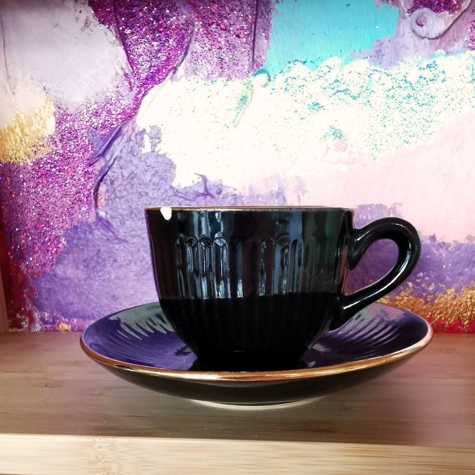 Sødt lille testel / mokkastel bestående af 7 forskellige kopper med underkopper. Den blå og sorte kop er desværre med skår.