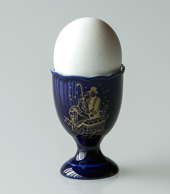Koboltblåt æggebæger fra Hackefors med H. C. Andersens Hyrdinden og skorstensfejeren i guld.