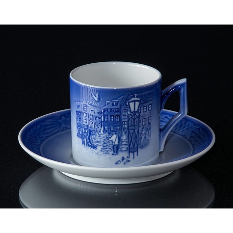 Royal Copenhagen julekop med underkop 2018, designet af Allan Therkelsen, med udsnit af motivet på Royal Copenhagen juleplatten 2018.