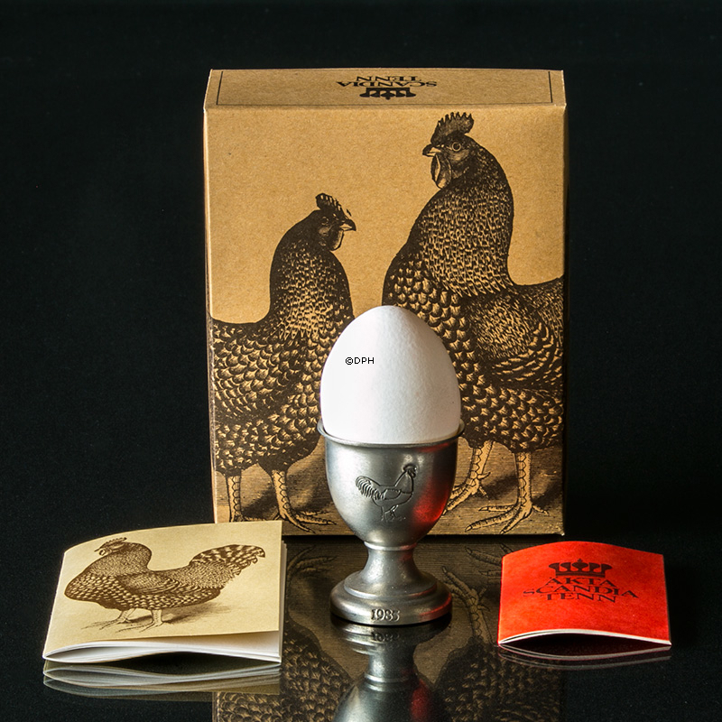 Scandia tin æggebæger 1985 med motiv af Rød Rhode Island hane og høne