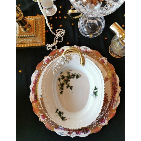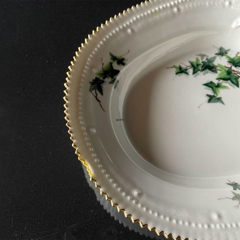 I stedet for de velkendte blomsterdekorationer prydes dette fad af en smuk efeu-dekoration, der findes både på skålen, låget og endda indvendigt i skålen. Fadet er desuden udsmykket med elegant guldbelægning på kanterne og hankene, hvilket giver det et eksklusivt og unikt udtryk. En sjælden perle for samlere og elskere af Royal Copenhagens kunstneriske mesterværker.