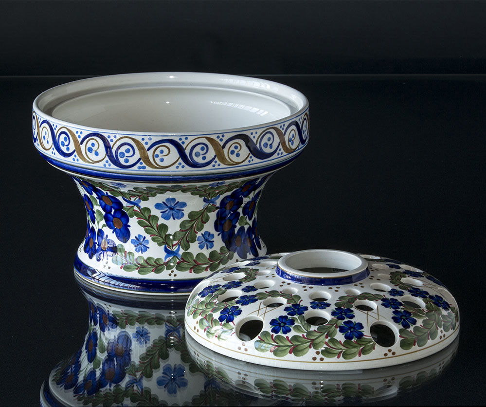 Aluminia skål / Jardiniere med blå blomster og flettede stilke. Grundfarven er en mat beige. Bruges til blomsterdekorationer.