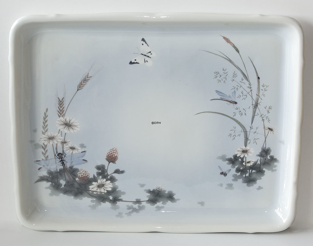 Kæmpe porcelænsbakke med blomster, guldsmed og sommerfugle, Royal Copenhagen