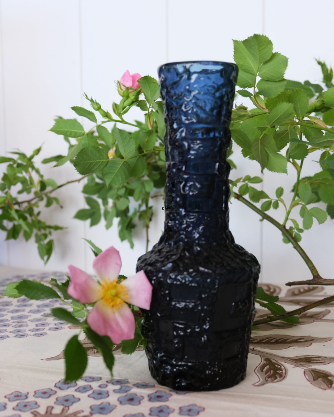 Mørkeblå vase i glas med rustikt mønster.