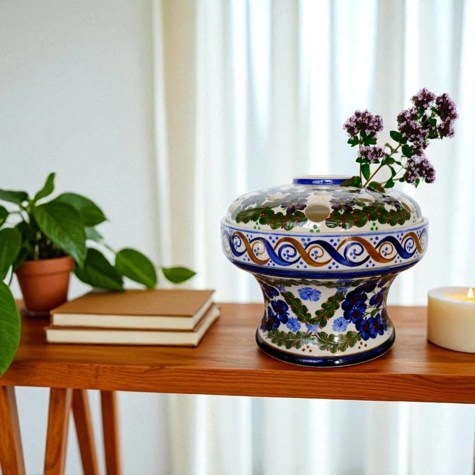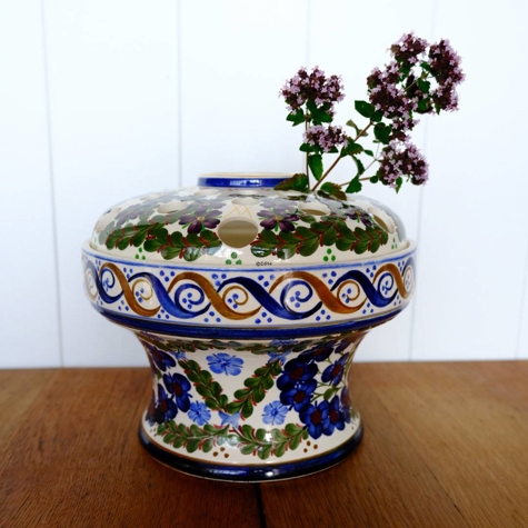 Aluminia skål / Jardiniere med blå blomster og flettede stilke. Grundfarven er en mat beige. Bruges til blomsterdekorationer. Overdel og underdel hører formodentlig ikke sammen oprindeligt. Nummer på underdel er 509-260, nummer på overdel 732-260. Låget passer ikke nøjagtigt til skålen og derfor sælges den som 2. sortering.
