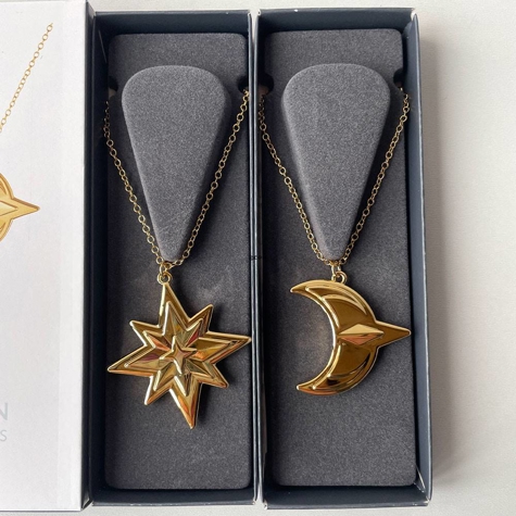 Georg Jensen Christmas Ornamenter 2024 2pak. Med motiv af stjerne og måne, designet af Sanne Lund Traberg. Finish: Zinklegering belagt med 18 kt. guld