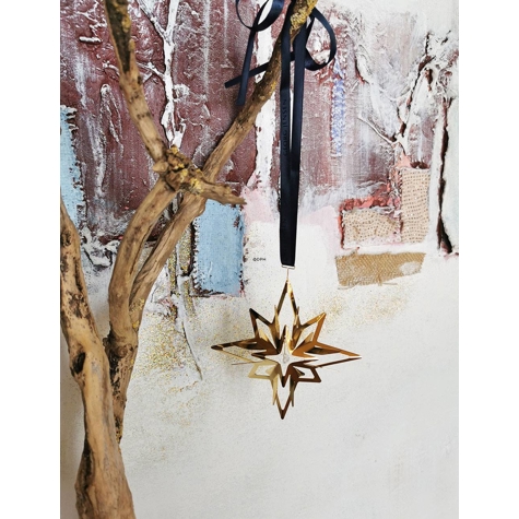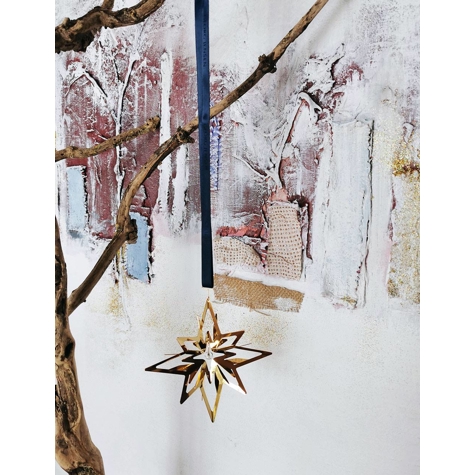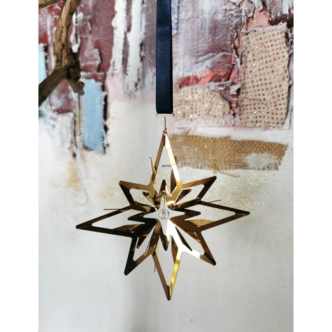 Georg Jensen juleuro 2024 Stjerne. Messing forgyldt med 18 kt. guld og designet af Sanne Lund Trabjerg Uroen leveres med det originale røde bånd, samt et specielt blåt bånd, som symboliserer den stjerneklare vinternat.