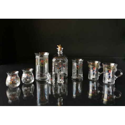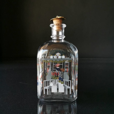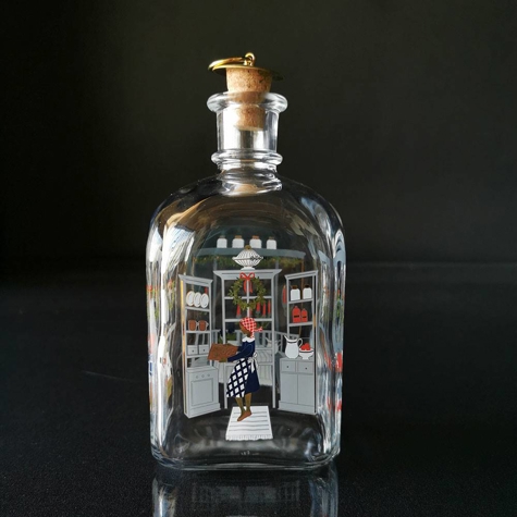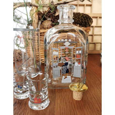 Juleflasken 2024 tager os med ind i det hyggelige køkken, hvor julens mad og bagværk bliver tilberedt. Pigen i køkkenet har netop taget en plade med kringler ud ad ovnen og vi kan næsten fornemme den himmelske duft af julekriglen med remonce af marcipan og måske lidt appelsin. Julekransen med dens røde sløjfe har fået en hædersplads i køkkenet, så julestemningen er i top. På den anden side af juleflasken ses en flot borddekoration, med røde, levende lys i flotte lysestager og hyacinther i glas, som spreder en dejlig frisk duft. Naturligvis er der også her dekoreret med en flot granguirlande foroven. På juleflaskens smalle sider ses to børn siddende ved at bord, hvor de er i gang med at dekorere årets adventkrans med smukke, røde lys. På den anden side ses et barn, som er i gang med at pakke julegaver ind i farvestrålende gavepapir. Kurven under bordet bugner allerede med julegaver i forskellige farver. På denne sise ses den traditionelle datomærkning, som markerer dagene fra fra 1.-24., så man kan få den daglige dram.